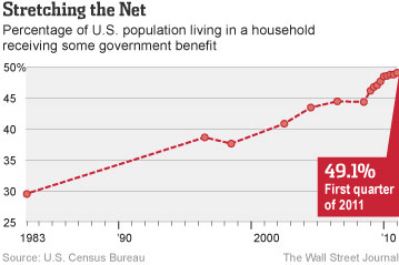 Government assistance is a different story in this country. A recent study by the US Census Bureau showed that 49% of households in the US receive some form of government handout (welfare, food stamps, health insurance, disability, etc.):