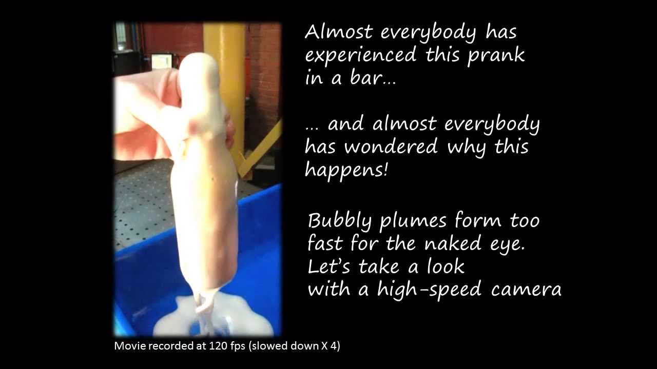 Individual plumes of bubbles float up through the beer, building up speed as they get bigger, until they burst out of the bottle’s top in a shower of foam. All of this happens within a matter of a few seconds and once the first tap is initiated is difficult to prevent.