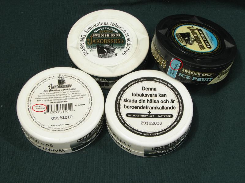 I'm looking at 2 cans of Jacobsson's Wintergreen here, one with an English label on the bottom (this one I probably got from Northerner) and the other with the Swedish health warning on the bottom (probably from BuySnus).